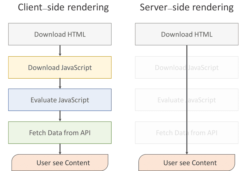 초기로딩속도 | 모든 JS 파일을 다운 받아와야 하기 때문에, 초기에는 오래 걸림 | CSR에 비해 다운 받는 파일이 많지가 않아 속도가 빠름 |